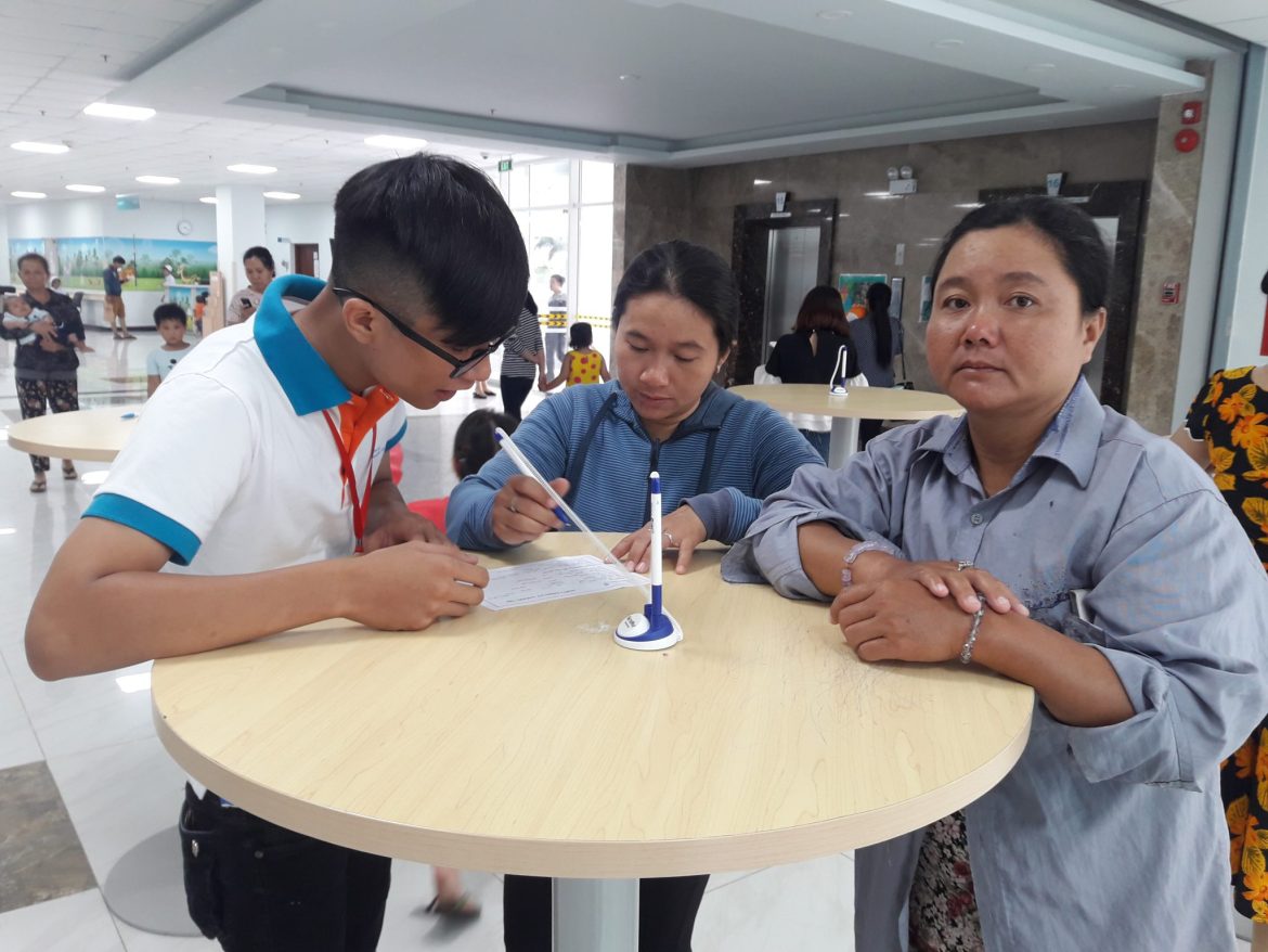 Các bạn tình nguyện viên đang hướng dẫn người nhà bệnh nhi về đăng ký thông tin trong quy trình khám bệnh.