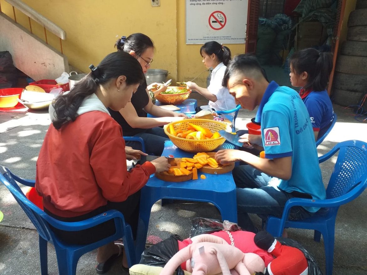 Các bạn tình nguyện viên tham gia chương trình “Suất ăn nghĩa tình” đang sơ chế nguyên vật liệu để chuẩn bị cho giai đoạn nấu cháo.