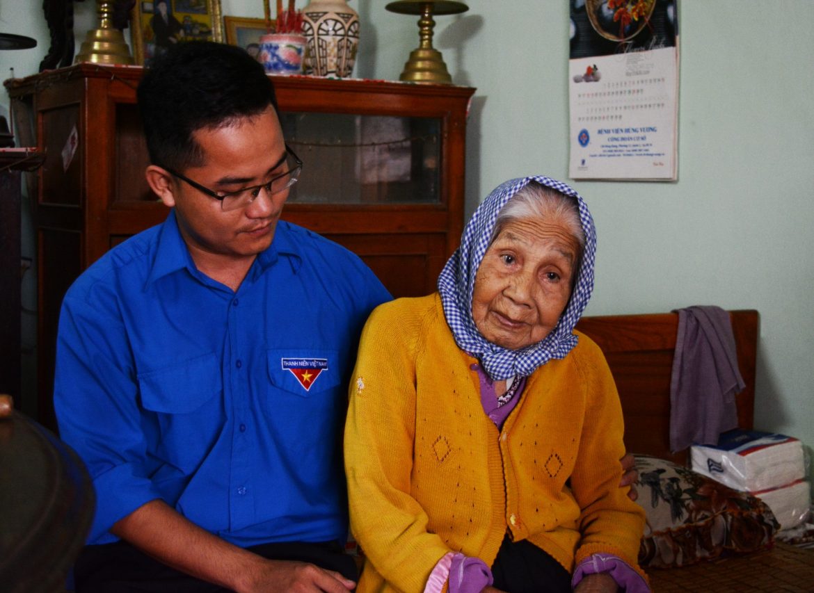 Anh Nguyễn Nhật Phúc – Công đoàn viên Công đoàn bộ phận Trung tâm Công tác xã hội Thanh niên Thành phố hỏi thăm Mẹ Việt Nam anh hùng Trần Thị Bảy.
